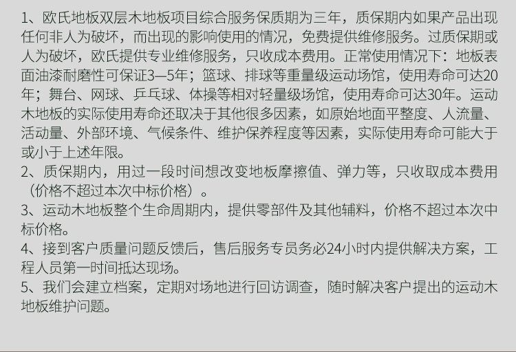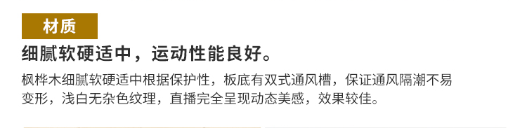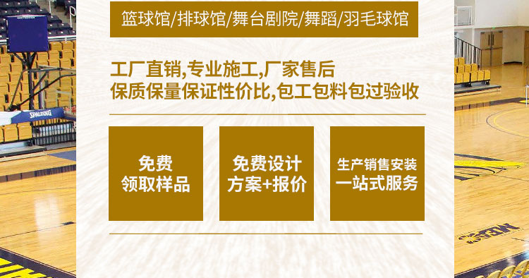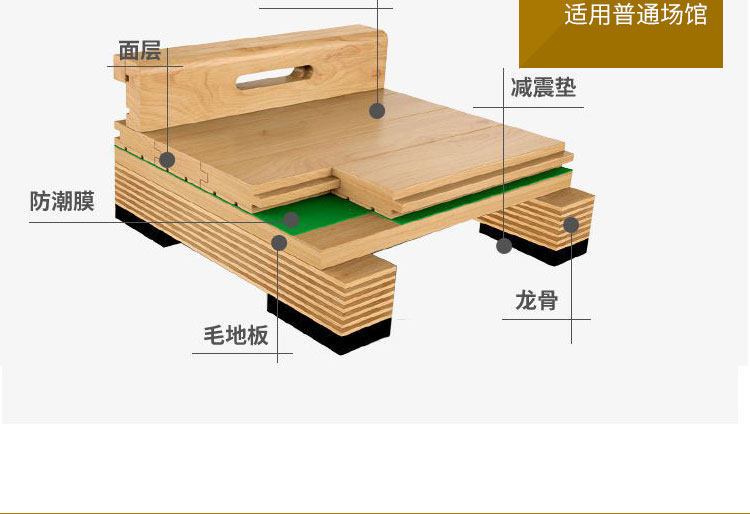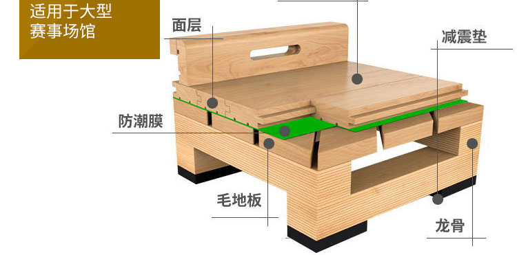 ,籃球木地板作為運動專用的木地板,它的牢固化使用壽命及承重必須達到比賽及訓練的要求,如活動籃球架及相關體育設施在移動時,木地板的表層及結構不能因此受到破壞等,因此籃球運動木地板結構相對復雜得多,層次也較多,對材質的物理及力學性能要求較高。此外,還有諸如地板的耐污染性、耐磨性、漆膜的硬度,要求表面不易起泡,對色差有嚴格的控制等品質細節方面要求。