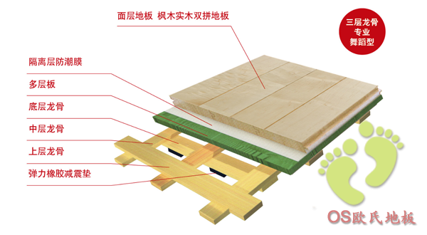 三層龍骨專業(yè)舞蹈型運動木地板系統(tǒng)